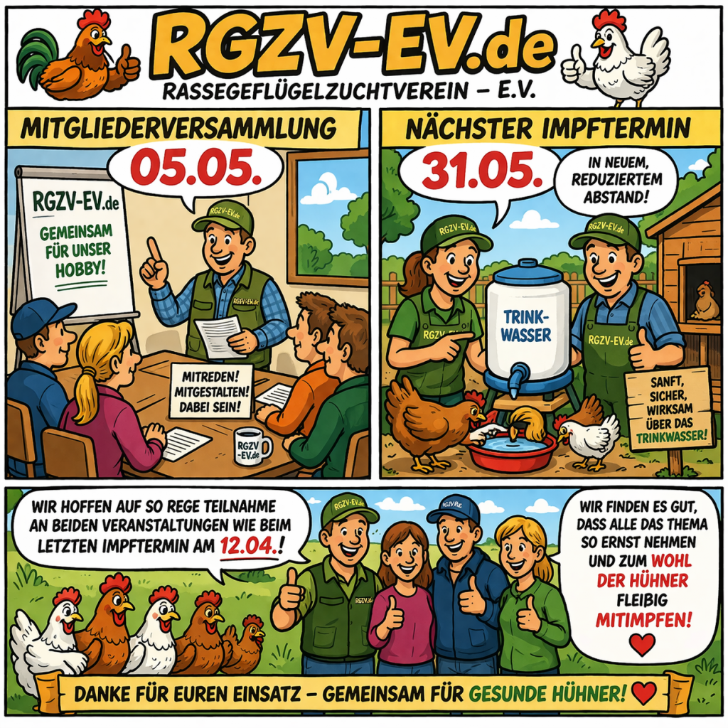 ein neues Jahr hat begonnen, und wir hoffen, ihr seid gut und gesund hineingestartet. Auch in diesem Jahr liegt wieder einiges vor uns: Geplant sind erneut vier Impftermine, bei denen wir gemeinsam für das Wohl unserer Tiere sorgen werden. Die genauen Termine findet ihr wie immer unter „Veranstaltungskalender“ oder unter Hennenzentrale.de.